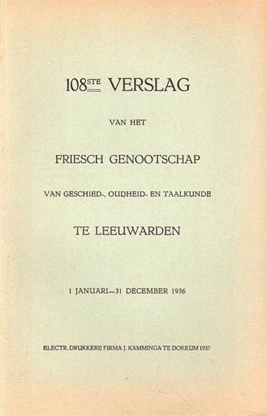 dit boekje met 77 pagina's bevat het 108ste verslag van het friesch genootschap van geschied-, oudheid- en taalkunde te leeuwarden van 1januar--31 december 1936. achterin staan de namen van buitenlandsche inrichtingen, binnenlandse inrichtingen en verder nog gewone leden.