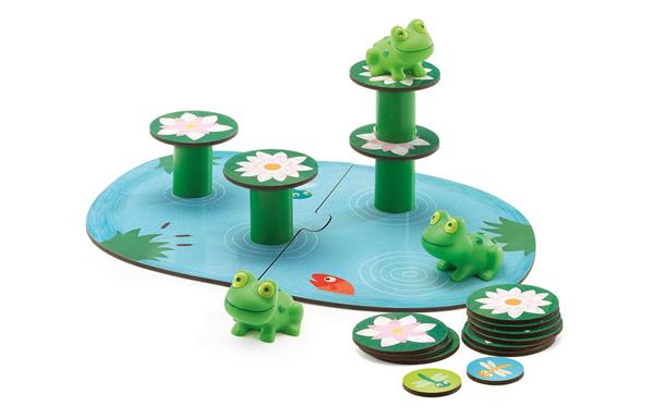 Met dit spel maken kinderen kennis met evenwicht. Het doel is om alle kikkers op een waterlelie te plaatsen. Om de beurt zetten de kinderen een houten blokje of een waterlelie, op de waterlelie worden de kikkers geplaatst. Lukt het om alle kikkers een plaatsje te geven zonder dat de torentjes omvallen?