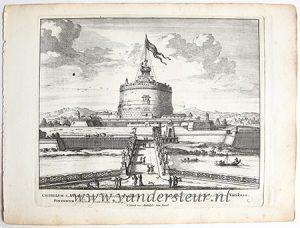 51st plate of 100 portraying Rome's palaces and ruins and even reconstruction of ancient buildings in Rome. The second state of these etchings were collected in the publication by Peter Schenck:'Roma aeterna, sive ipsius aedificiorum Romanorum, integrorium collapsorumque, conspectus duplex. ' In the 'Aedificiorum Index':'51. ... Castel-/lum S. Angeli', view on Castel Sant'Angelo and on the bridge in front of it. Inscribed on the bottom in Latin and Dutch:'CASTELLUM S. ANGELI... / P Schenck exc: Amstelod: cum Privil:'