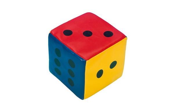 Grote gekleurde dobbelsteen met getalbeelden. De dobbelsteen neemt altijd terug zijn oorspronkelijke vorm aan.